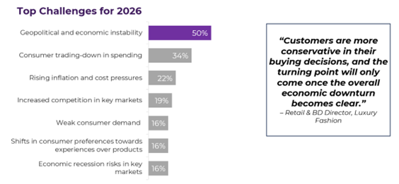 Luxury executives see macro uncertainty as the primary challenge for 2026. The top concerns include geopolitical instability, consumer trading-down behavior, and inflationary pressures, reflecting growing sensitivity to economic volatility and shifting spending priorities among affluent consumers.