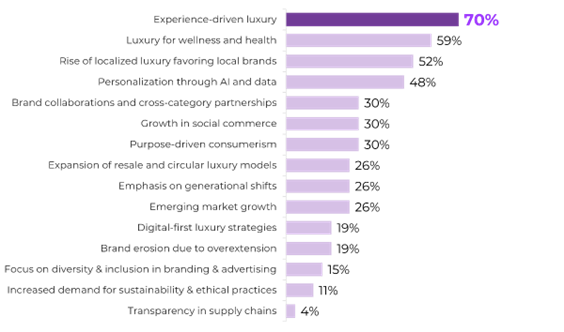 The industry continues to pivot toward experience-driven luxury, with 70% of leaders identifying experiential luxury as the leading trend shaping the sector. Wellness-focused luxury, localised brand positioning, and AI-enabled personalisation are also gaining momentum, signaling a shift toward holistic lifestyle engagement rather than product-centric luxury alone.